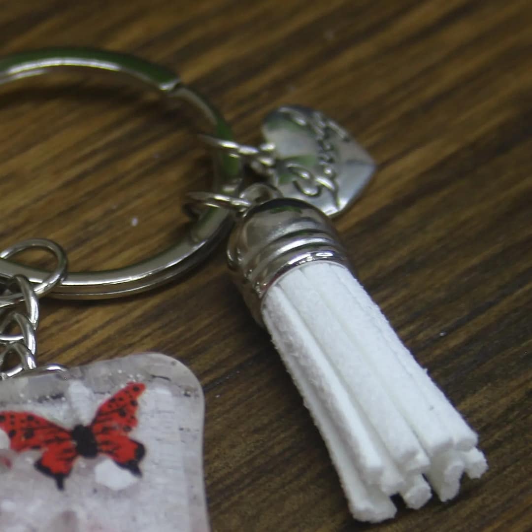 The design features a bold red-and-white blend, paired with delicate butterflies that symbolize transformation and freedom. Every swirl of pigment and every tiny detail is suspended beautifully in crystal-clear resin, creating a glossy, glass-like finish. Accented with a soft white tassel, a polished silver clasp, and an additional letter charm, this piece offers a complete, elegant set ready to attach to keys, handbags, backpacks, or even gift boxes.