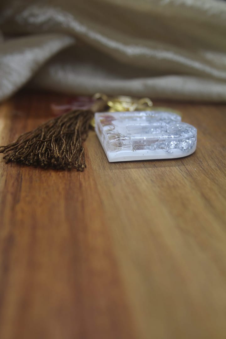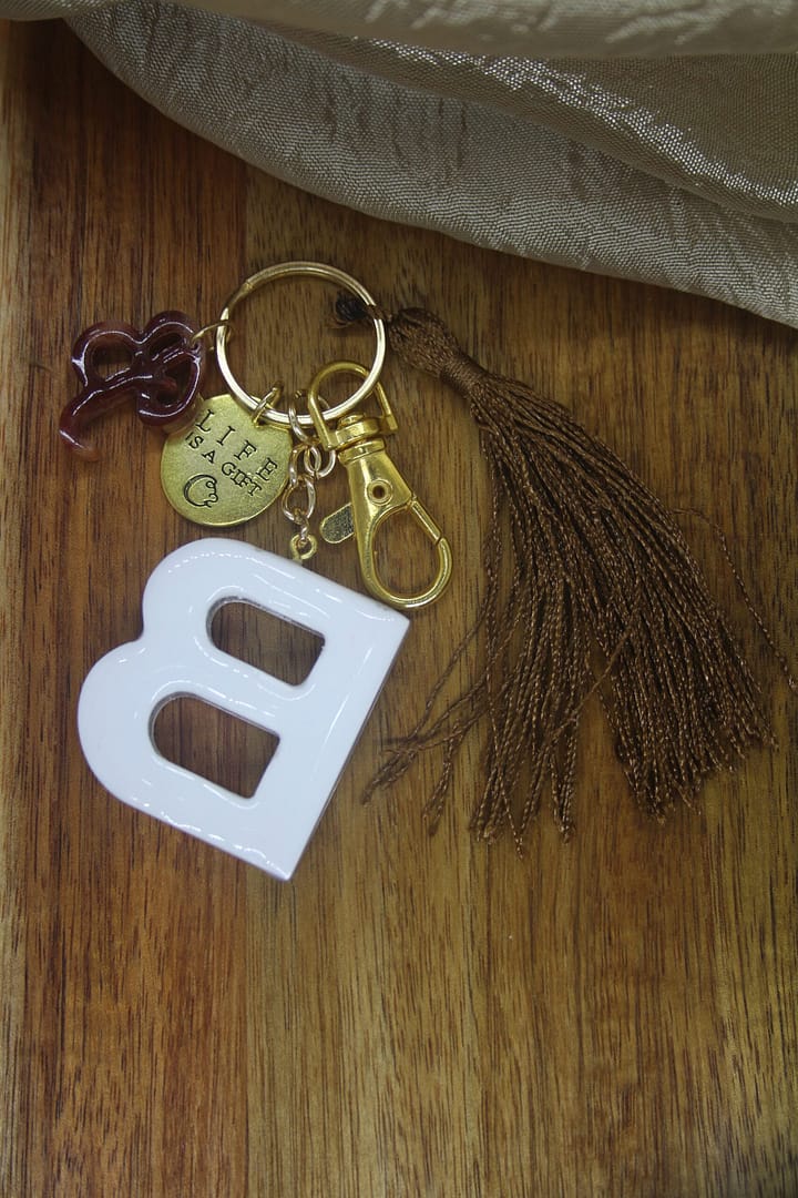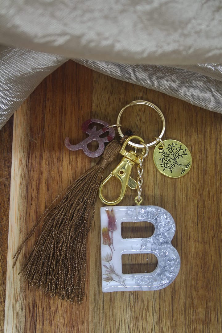 The Letter B Resin Keyholder is a harmonious balance of strength and elegance, designed to turn a simple daily object into something personal and empowering. Made from hand-poured resin, its clean white base is infused with subtle silver leaf accents, giving it a quiet shimmer that catches the light. A refined gold keyring, delicate small ‘b’, and a symbolic gold pendant elevate its sophistication, while a long thread tassel adds graceful movement and texture.