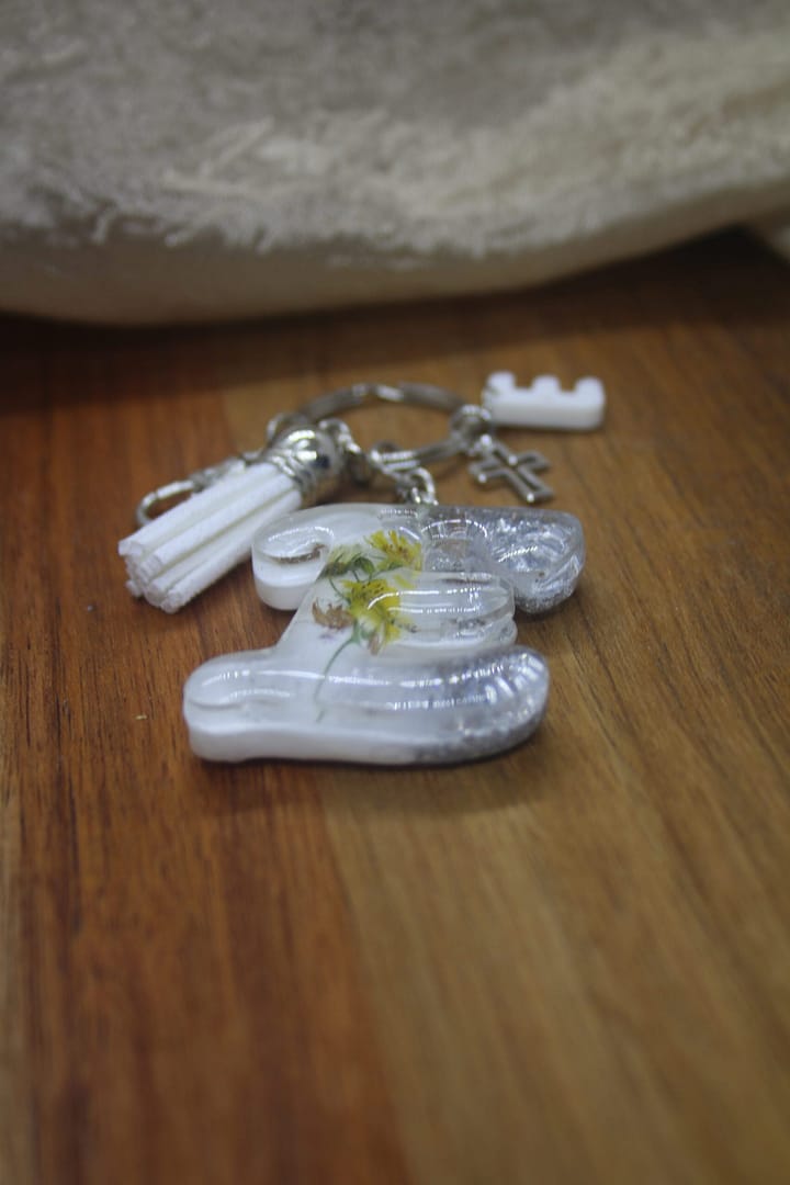The Letter E Resin Keyholder is a soulful fusion of natural beauty and spiritual elegance. Hand-poured in crisp white resin, this piece features a delicate silver leaf for a touch of shine and grace, paired with vibrant yellow flowers that bring a sense of warmth, joy, and renewal. A small silver cross adds quiet faith and meaning, while the white leather fossil grounds the piece with subtle texture and softness.