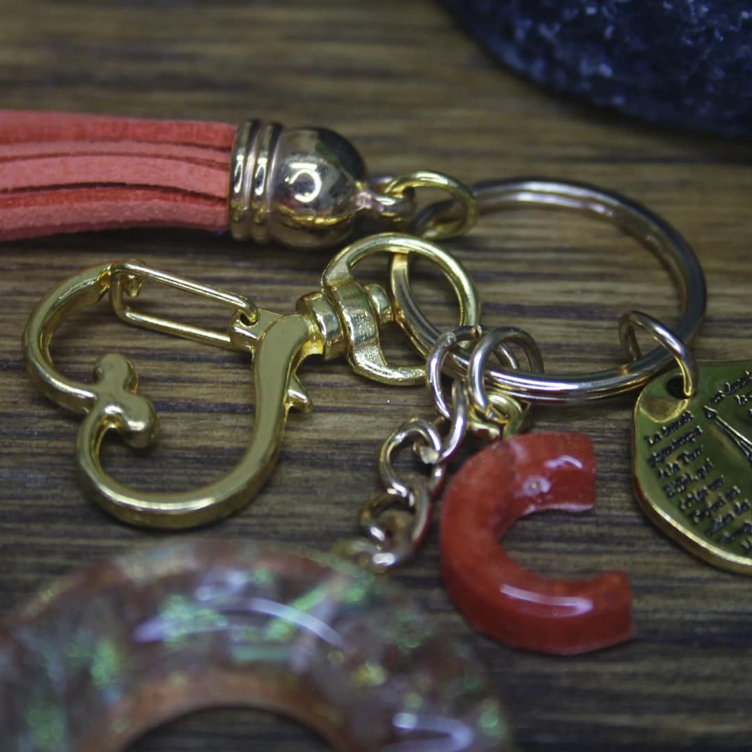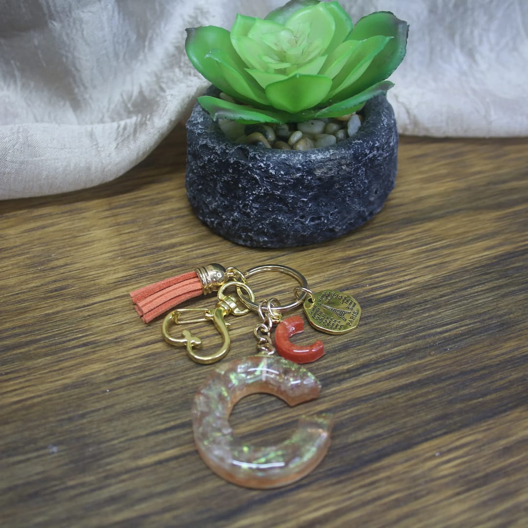 Add a touch of elegance to your everyday essentials with this handcrafted Resin “C” Keychain. Designed with shimmering resin, a coral tassel, gold accents, and a mini charm, it’s perfect for personalizing your keys, gifting, and collecting unique handmade pieces.